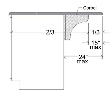 2. Overhangs greater than 15” require the installation of corbels. Corbels must be designed to support the weight of the countertop and be mounted to studs or an equivalent load bearing structure. Corbels can support no more than 24” of overhang and must be spaced no more than 36” apart.