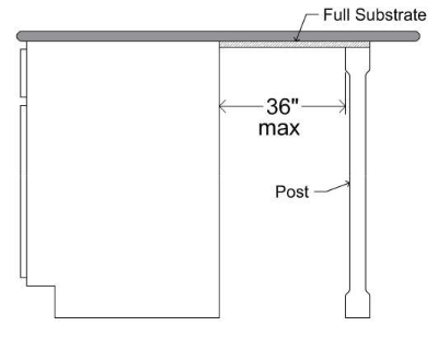 3. Overhangs that exceed 24” requires the use of substrate and posts installed evenly spaced at a maximum of 36” apart.